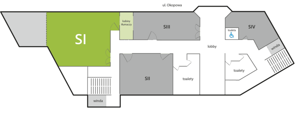 Sala SI nadaje się również do organizacji konferencji międzynarodowych. Sprzęt do tłumaczeń symultanicznych nie jest jednak w standardowym wyposażeniu – można go wypożyczyć za dodatkową opłatą. Opłata za 1 zestaw do tłumaczeń wynosi 30 zł.